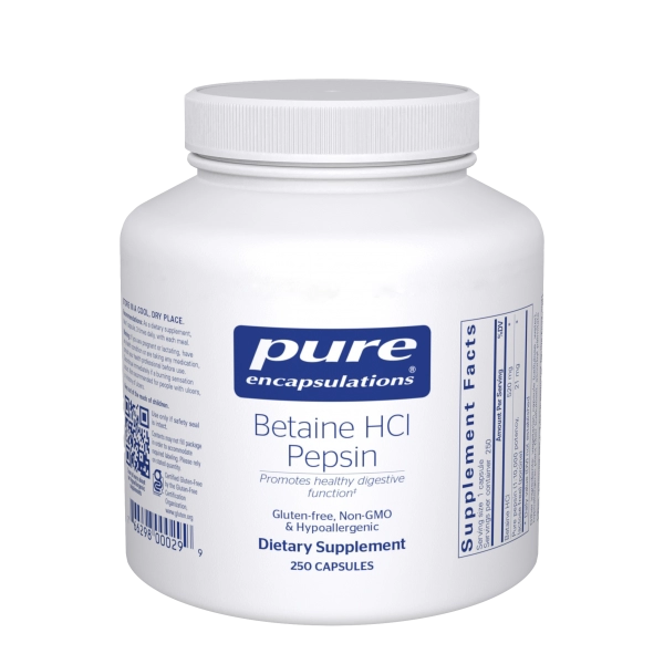 Betaine HCl and pepsin are gastric-juice components essential to the digestion of food and absorption of most nutrients.1 In particular, betaine HCl is necessary for adequate absorption of protein, calcium, vitamin B12 and iron.2 The low pH of the stomach’s hydrochloric acid destroys ingested bacteria and microorganisms.3,4 This formula can be beneficial for anyone seeking enhanced digestive function.