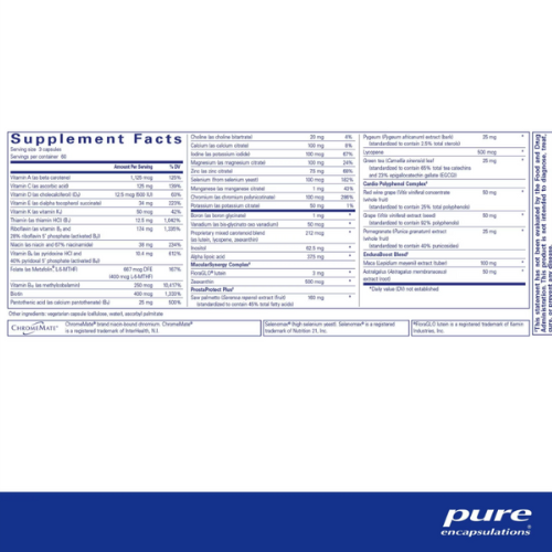 Formula with activated vitamins and superior mineral chelates for optimal absorption.1 Yeast-derived selenium, vitamin D and zinc for prostate health.2 Metafolin® ,L-5-MTHF,is the naturally occurring universallymetabolized form of folate.3 MacularSynergy Complex enhances the integrity of the macula and retina with lutein and zeaxanthin. Synergistic cofactors include vitamin C, vitamin E, zinc and carotenoids.4 ProstaProtect Plus‡ supports prostate function with saw palmetto and pygeum and maintains healthy prostate cells with lycopene and green tea. Synergistic cofactors include selenium, vitamin D and zinc.5-11 Cardio Polyphenol Complex‡ maintains healthy blood vessel function with polyphenols from pomegranate, red wine concentrate and grape seed extract.12, 13 EnduraBoost Blend combines astragalus and maca to promote cellular energy, endurance and stamina.14‡