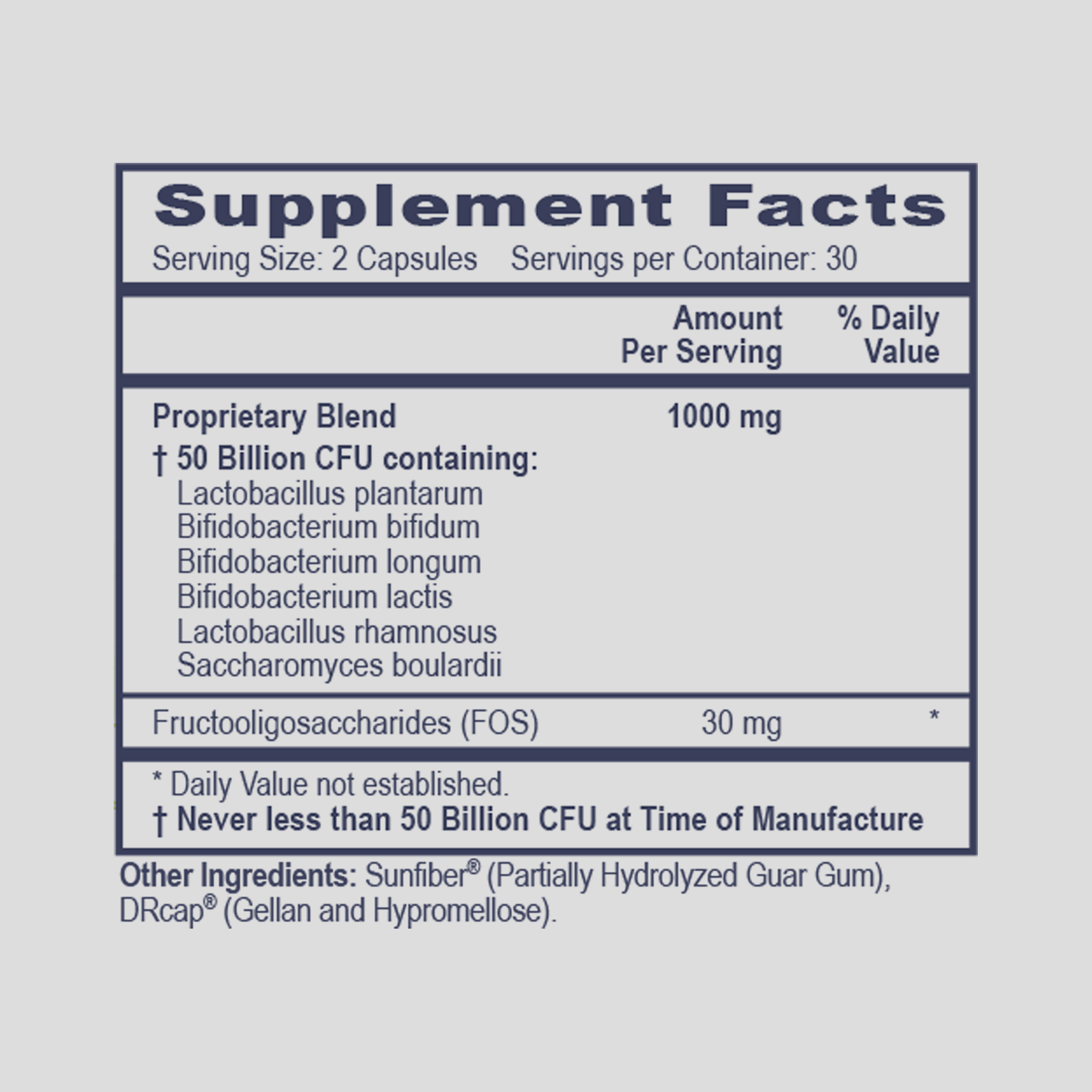 High potency probiotic formulation containing 50 Billion organisms per capsule.