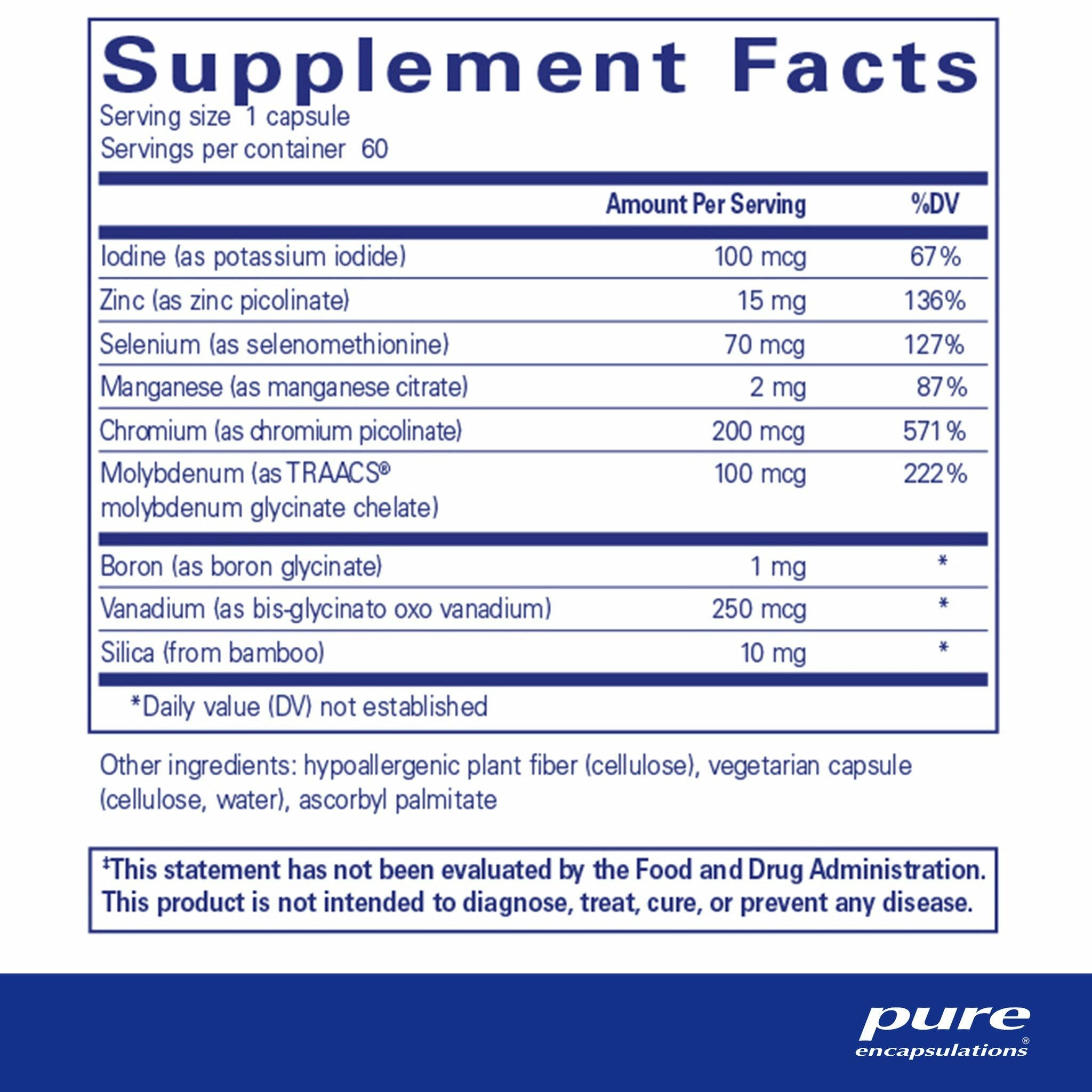 TraceMinerals contains a blend of essential minerals to support nutrient metabolism and cellular function throughout the body.1,2 These minerals are important enzyme cofactors for numerous processes, including cellular energy production and the synthesis of hormones, neurotransmitters and DNA.3 This formula provides trace minerals in a balanced combination, without macrominerals, to promote optimal bioavailability.‡